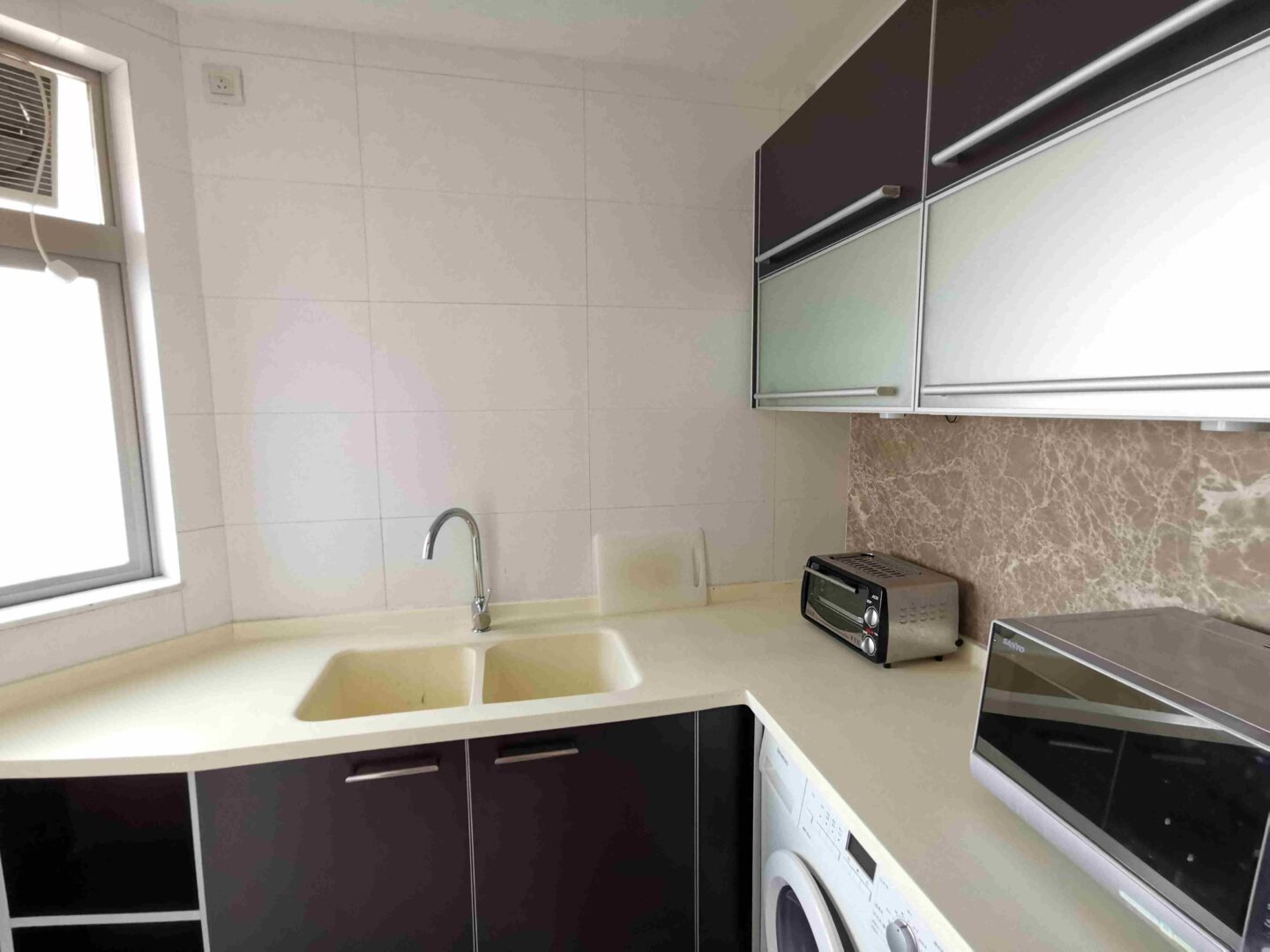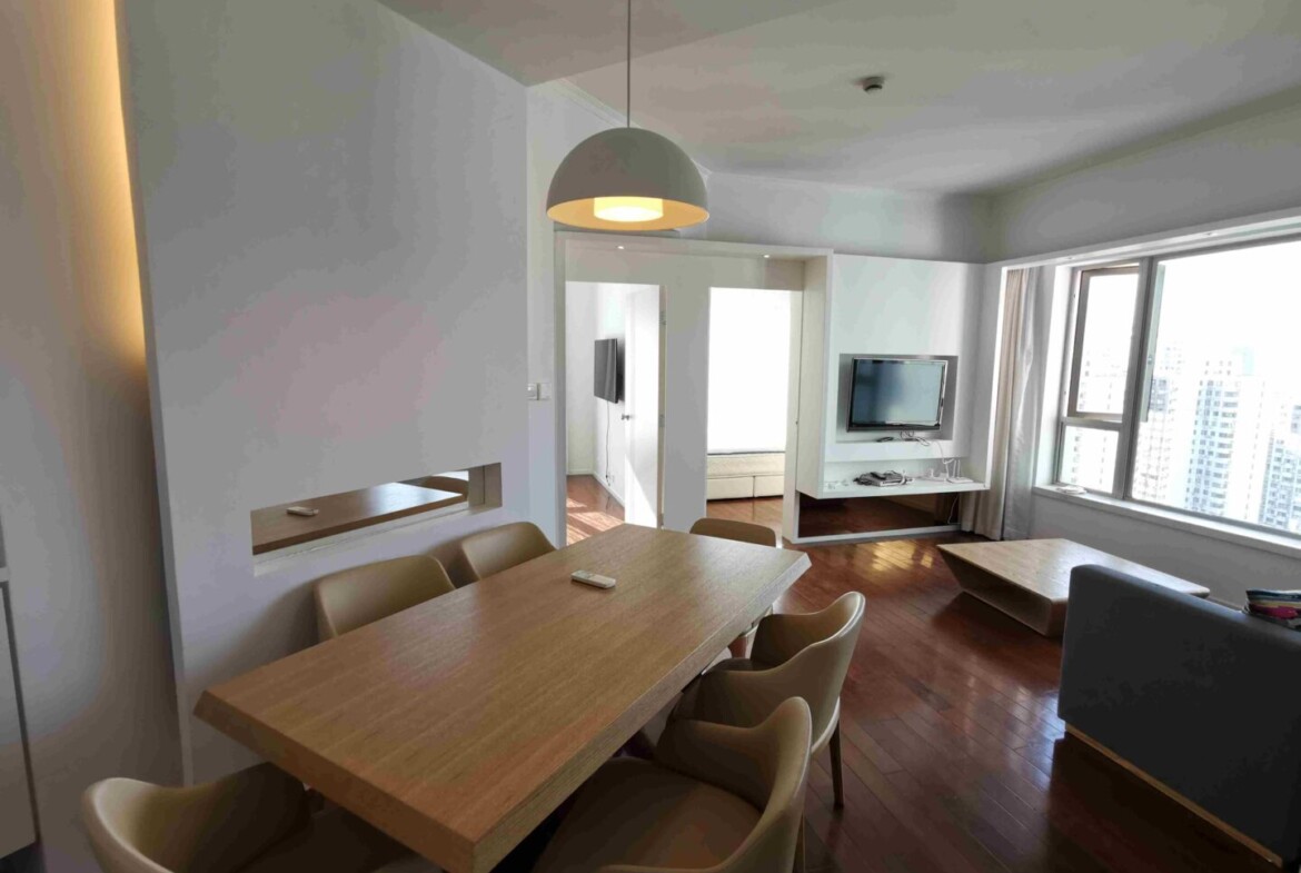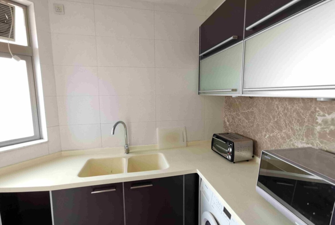 The living and dining area is designed for conversation and comfort, with large windows framing an open skyline that sparkles after dusk. A thoughtfully renewed kitchen features clean-lined cabinetry, generous counter space, and practical storage, ideal for weeknight meals or weekend entertaining. Both bedrooms are well proportioned, creating a sensible separation between private and social zones. The primary bathroom includes a proper bathtub, a rarity in Shanghai and a welcome luxury for evening unwinding.