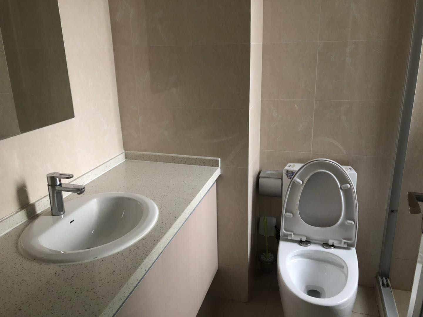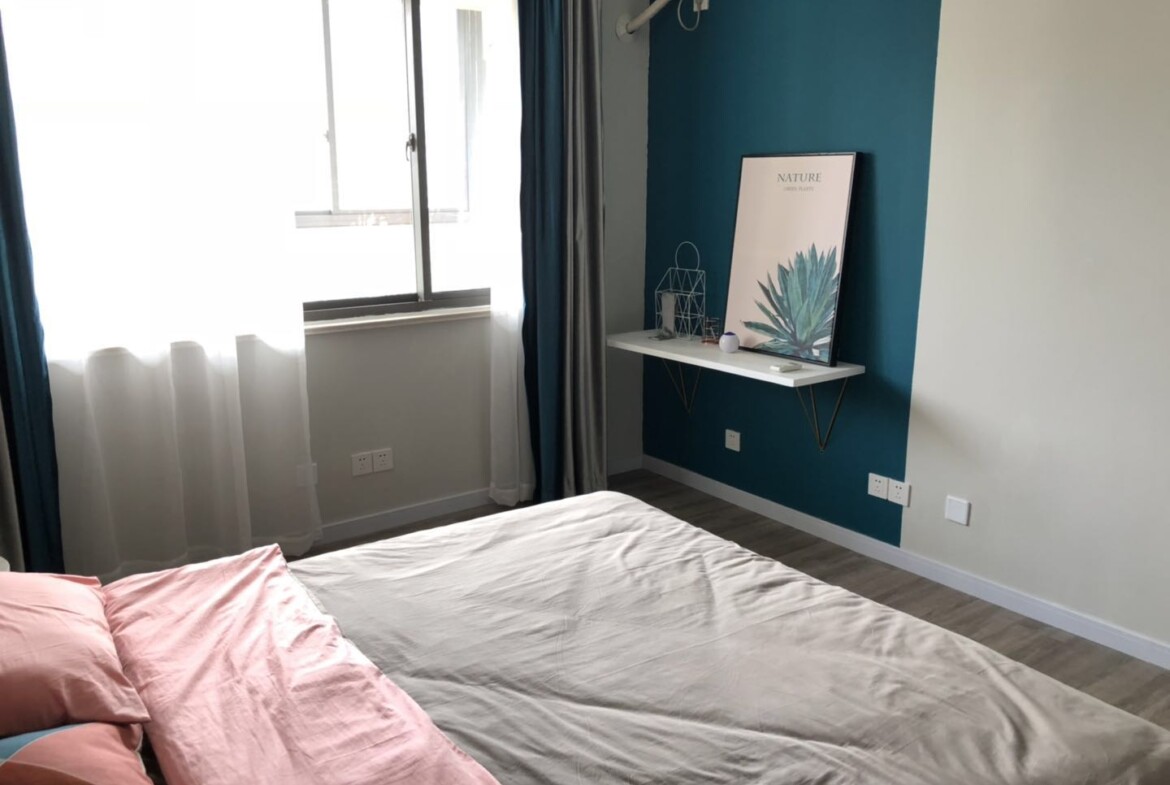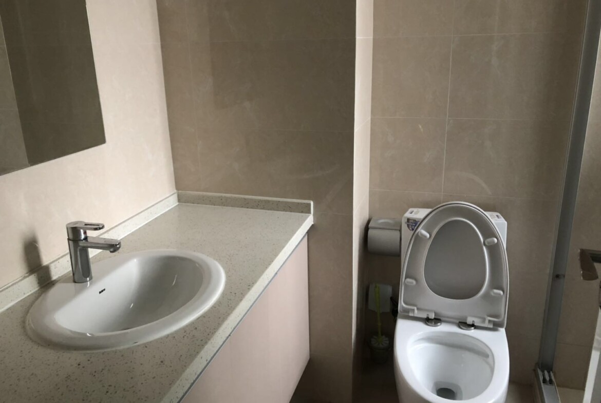 The primary bedroom accommodates a queen bed and wardrobes; the second room flexes as a guest space or a quiet study. In the bathroom, a full-sized bathtub is a rare Shanghai luxury for evening soaks. Fresh tiling, new fixtures, and well-placed lighting emphasize the clean, contemporary finish.