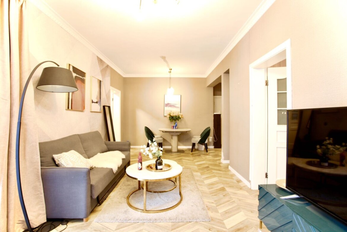 The heart of the apartment opens to a wood-decked terrace, an uncommon luxury in this central locale. It is an inviting extension of the living space where you can enjoy morning coffee, cultivate potted herbs, or host intimate alfresco dinners. Air conditioning ensures year-round comfort, while the renovation introduces modern fixtures, sleek storage solutions, and low-maintenance finishes tailored to busy city living.