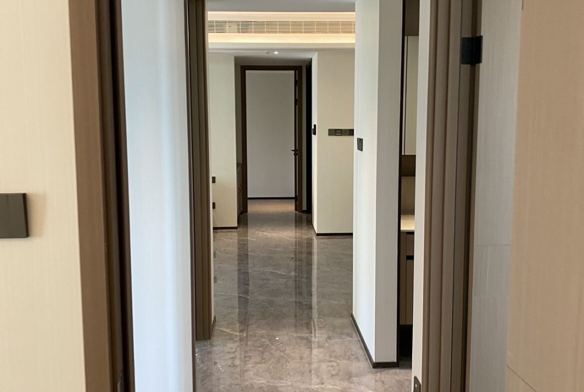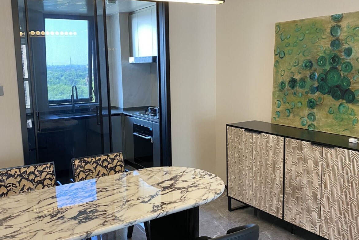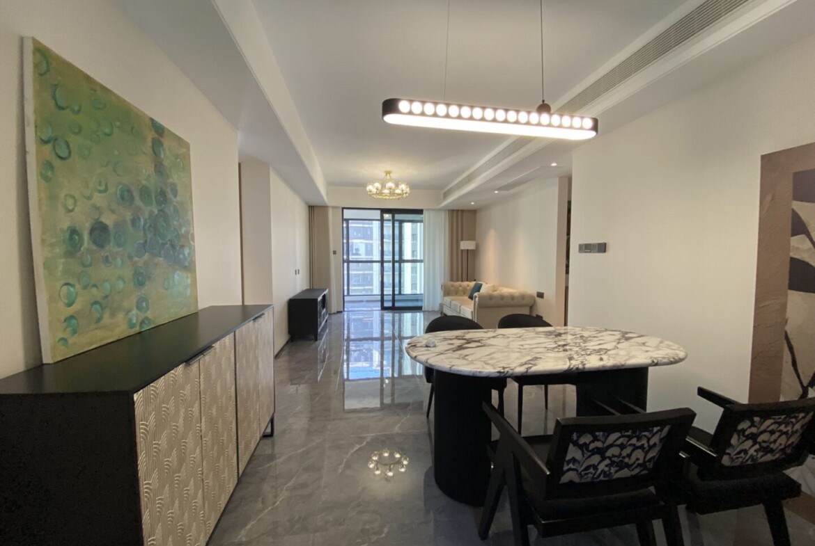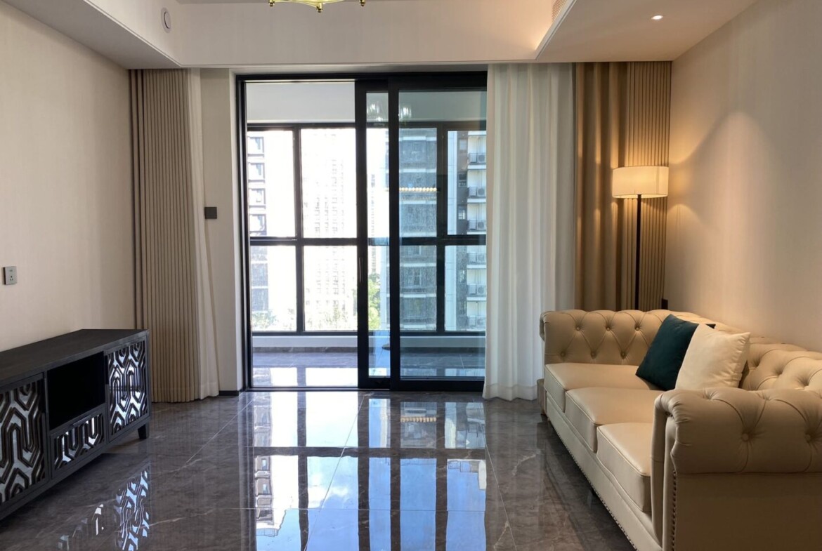 This freshly completed, first-rental 4-bedroom, 2-bathroom apartment in Nanshan Qianwan Shiyi showcases a thoughtful layout for families and professionals who value light, space, and quiet. Floor-to-ceiling windows draw in soft natural light throughout the day, while the generous living and dining zone flows out to a private balcony for morning coffee or evening conversations above tree-lined lanes.