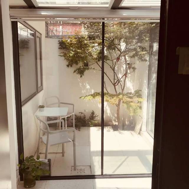 Floor-to-ceiling windows open the living area to a private yard, rare in central Shanghai. It is perfect for a morning espresso, a potted herb garden, or a quiet place to read after work.