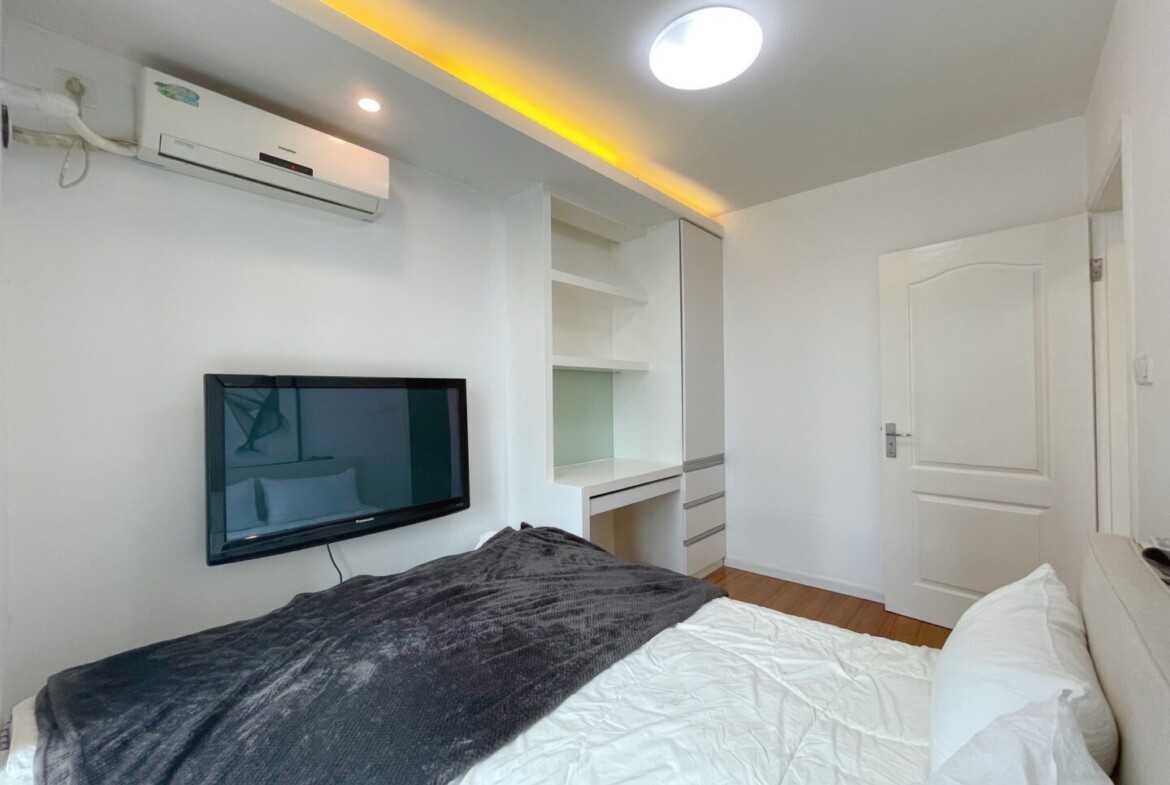 Floor-to-ceiling windows flood the living area with natural light, while a private balcony extends your space for coffee breaks, reading, or a small container garden. The bathtub adds a welcome touch of home comfort, and air conditioning keeps temperatures just right year-round.