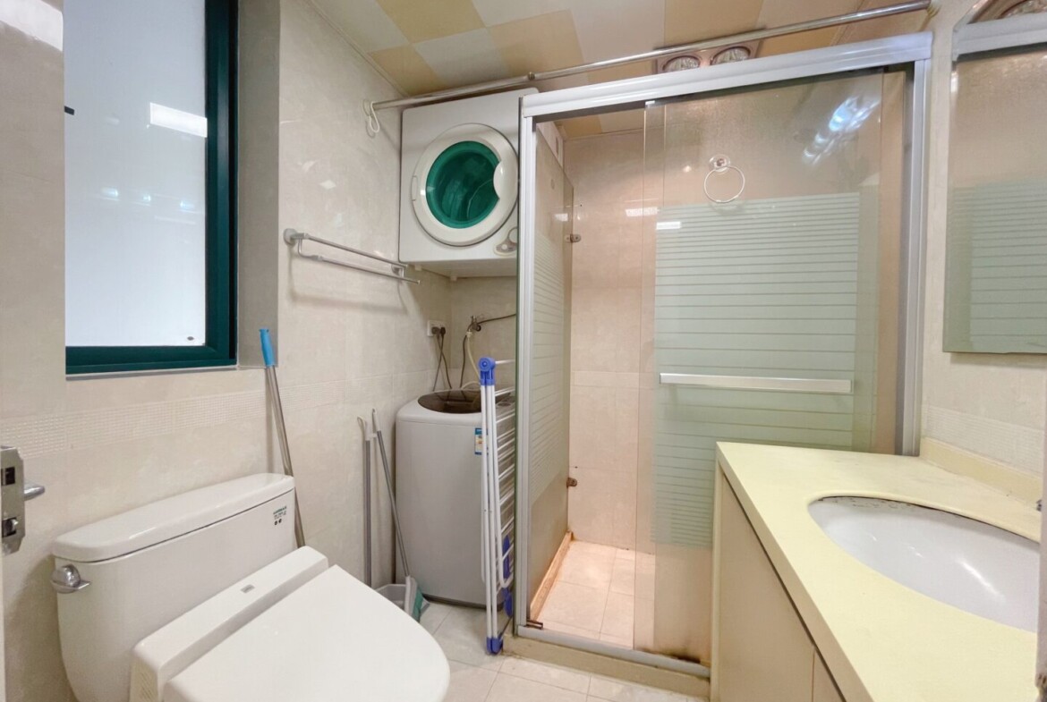 The practical kitchen is fitted with gas cooking, a preferred choice for home chefs seeking precise heat control, while the bathroom features a bathtub that is increasingly rare in Shanghai rentals, ideal for a restorative soak after a long week. Efficient air conditioning supports year-round comfort for both cooling and heating needs.