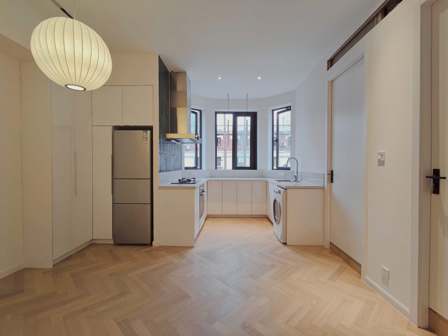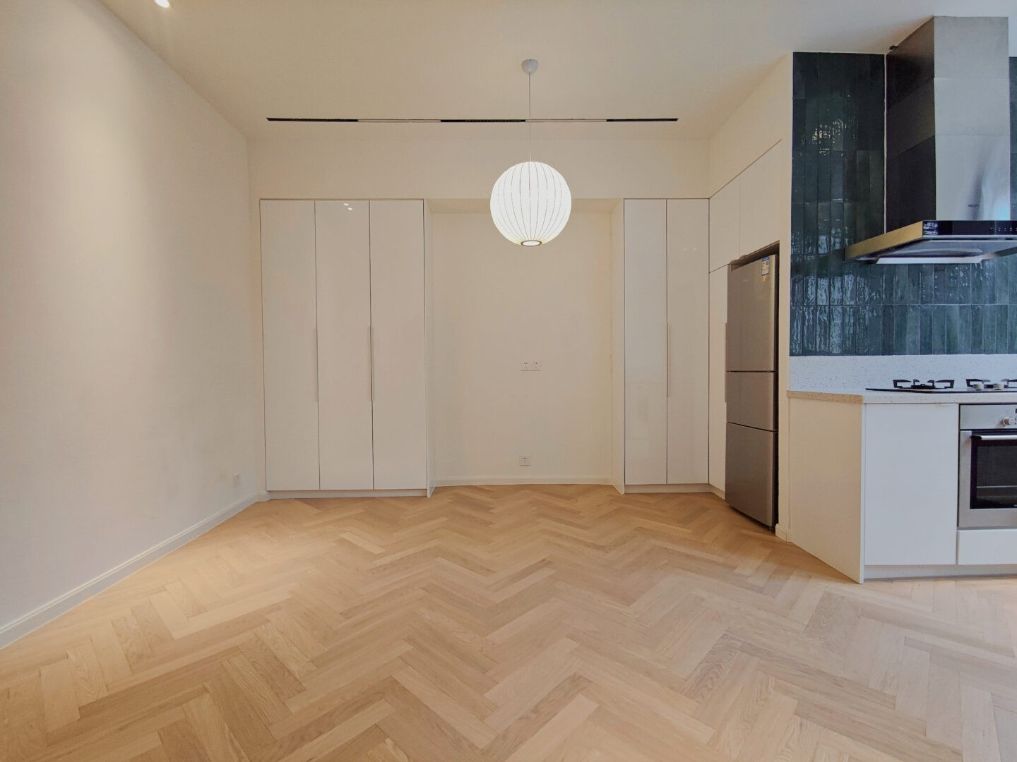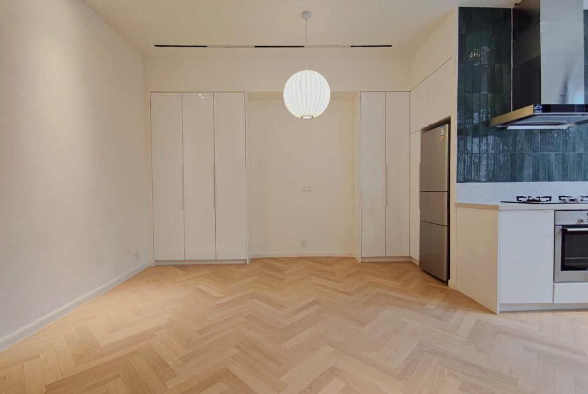 This bright one-bedroom, one-bathroom home sits within a traditional lane house on Nanchang Road, blending old-world character with a fully renovated interior that is ready for modern city living. Natural light pours into the living area, creating a warm, uplifting ambiance that suits both relaxed evenings and productive work-from-home days.