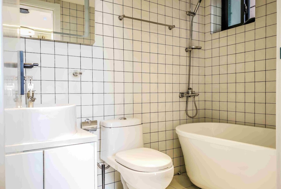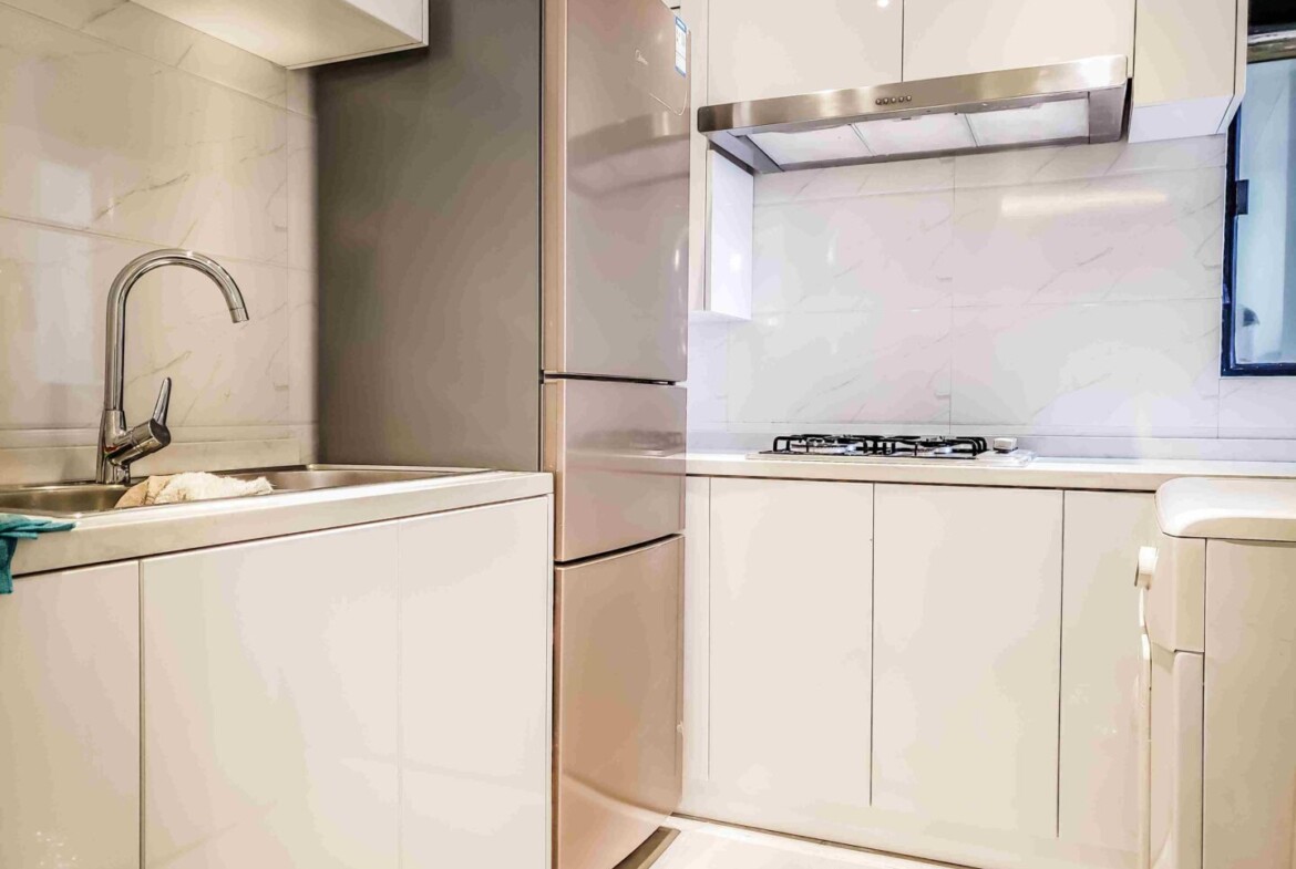 The interiors showcase a nice color palette of warm neutrals and soft charcoal accents, creating a cozy atmosphere that suits both minimalist and layered décor. The kitchen is fitted for real cooks with gas hobs, ample cabinetry, and durable worktops. Year-round comfort is ensured by air conditioning and heating. The primary bathroom features a bathtub, a rare luxury in central Shanghai, while the second bath serves guests and family with practical ease.
