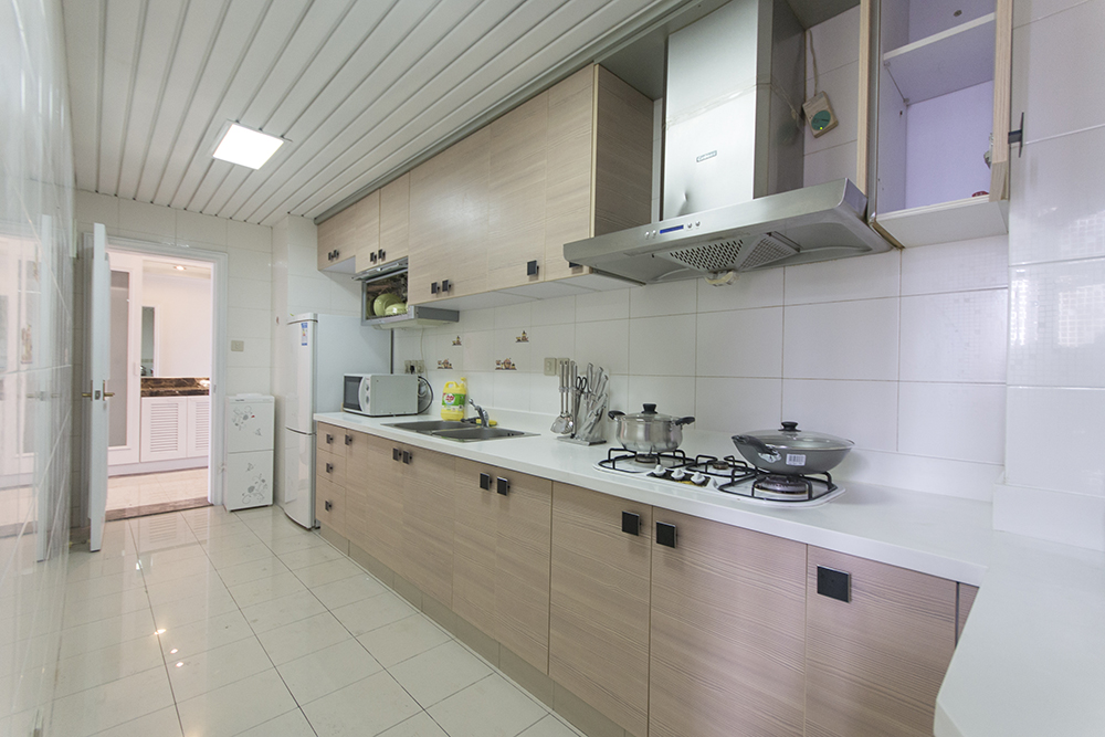 Climate control is effortless thanks to central air conditioning, maintaining consistent comfort across seasons. The kitchen is designed for practical cooking, with ample storage to keep surfaces clear and routines smooth. Being on a higher floor, the apartment enjoys wider city views and reduced street noise, enhancing a feeling of retreat while keeping you connected to Xujiahui‘s energy.