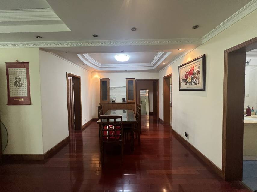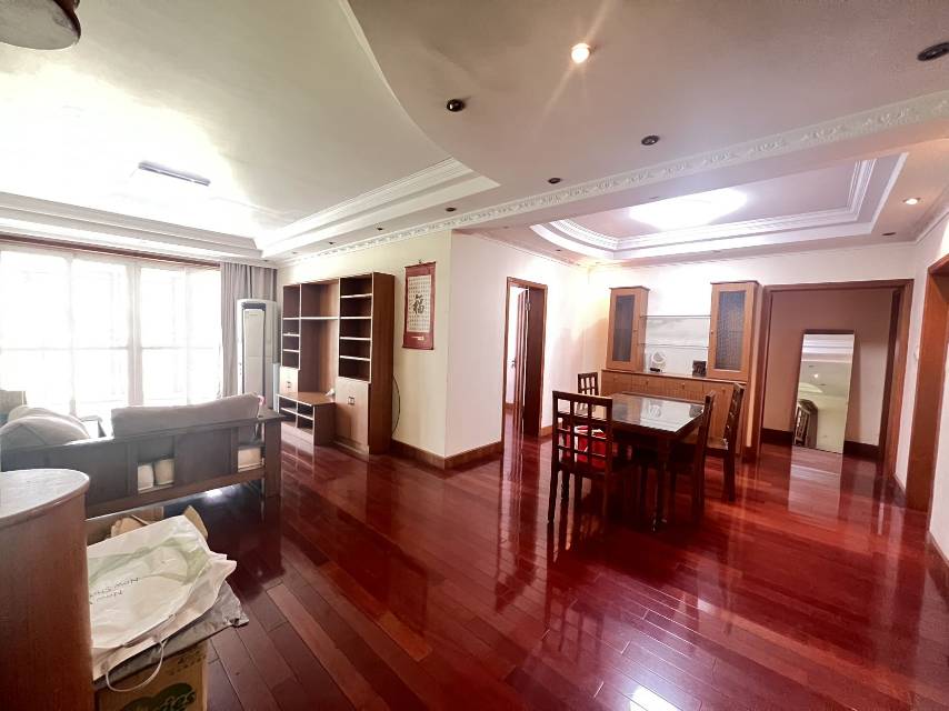 This bright three-bedroom, two-bath apartment in Zhongshan Gongyu balances practical design with a warm, lived-in character that resonates with expat families and professionals. The living area opens to a sun-catching balcony, ideal for morning coffee or evening breezes, while the dark wood floors lend a grounded, classic ambiance that pairs well with both contemporary and traditional furnishings.