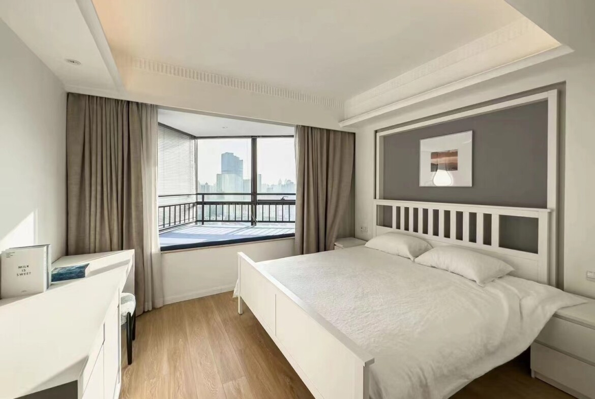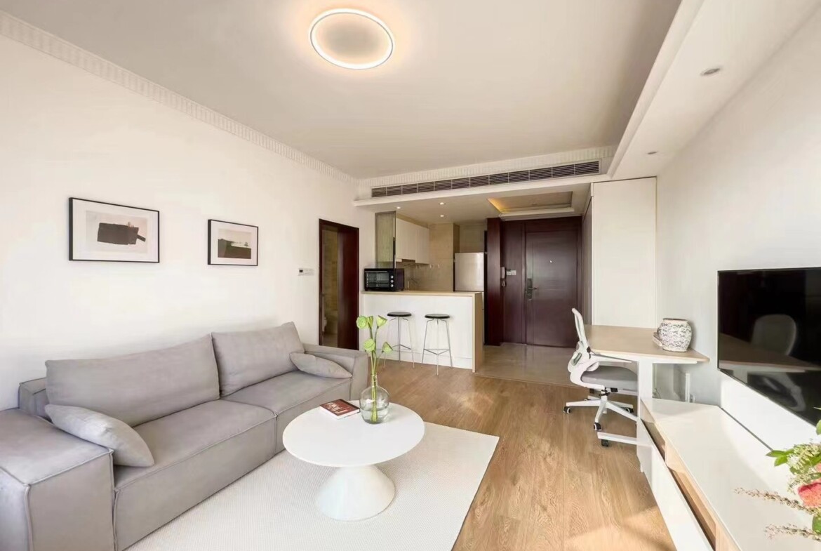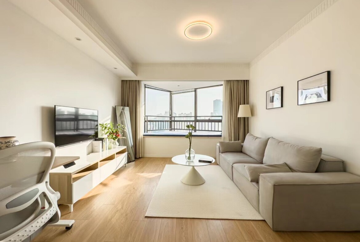 Step into this beautifully fully renovated 1-bedroom modern apartment on the sought-after Jiangning Road. The interior has been thoughtfully designed to create a seamless flow between living spaces, offering a refreshing sense of openness and light. Floor-to-ceiling windows bathe the apartment in natural daylight, providing expansive city views and a tranquil retreat from Shanghai’s vibrant pace. The spacious living room is equipped with air conditioning and heating for year-round comfort, while the sleek bathroom features a luxurious bathtub—a rare indulgence perfect for relaxing after a busy day.