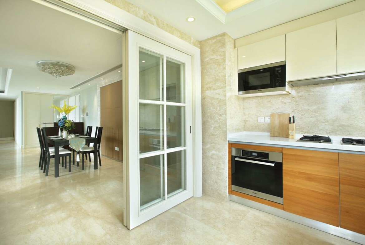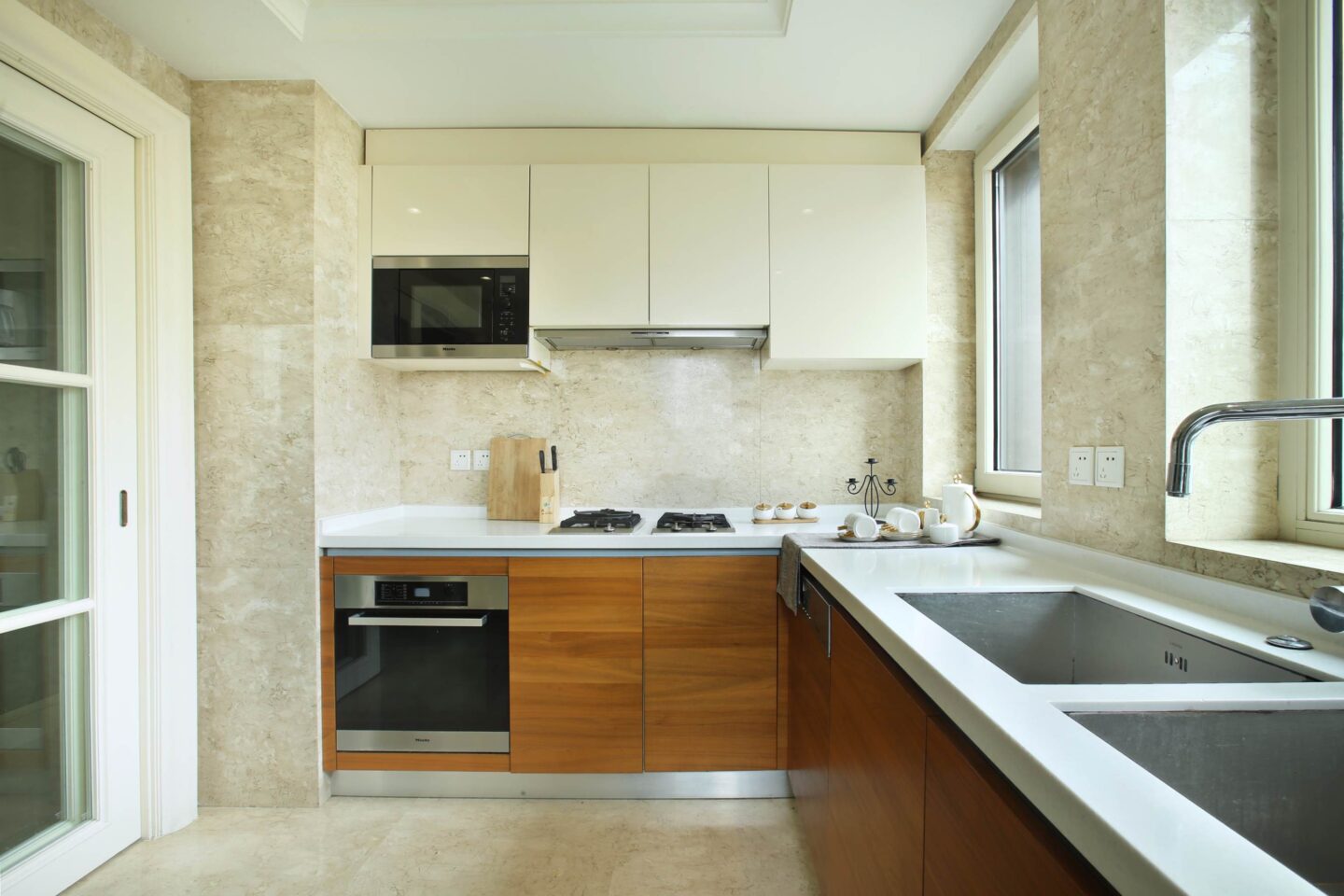 The kitchen, arranged for efficient prep and cooking, supports both quick weekday meals and weekend dinner parties. Thoughtful storage solutions help keep daily life organized, and quality fixtures feel solid to the touch. Subtle details, from discreet lighting to practical flooring, make maintenance easy and living pleasant.