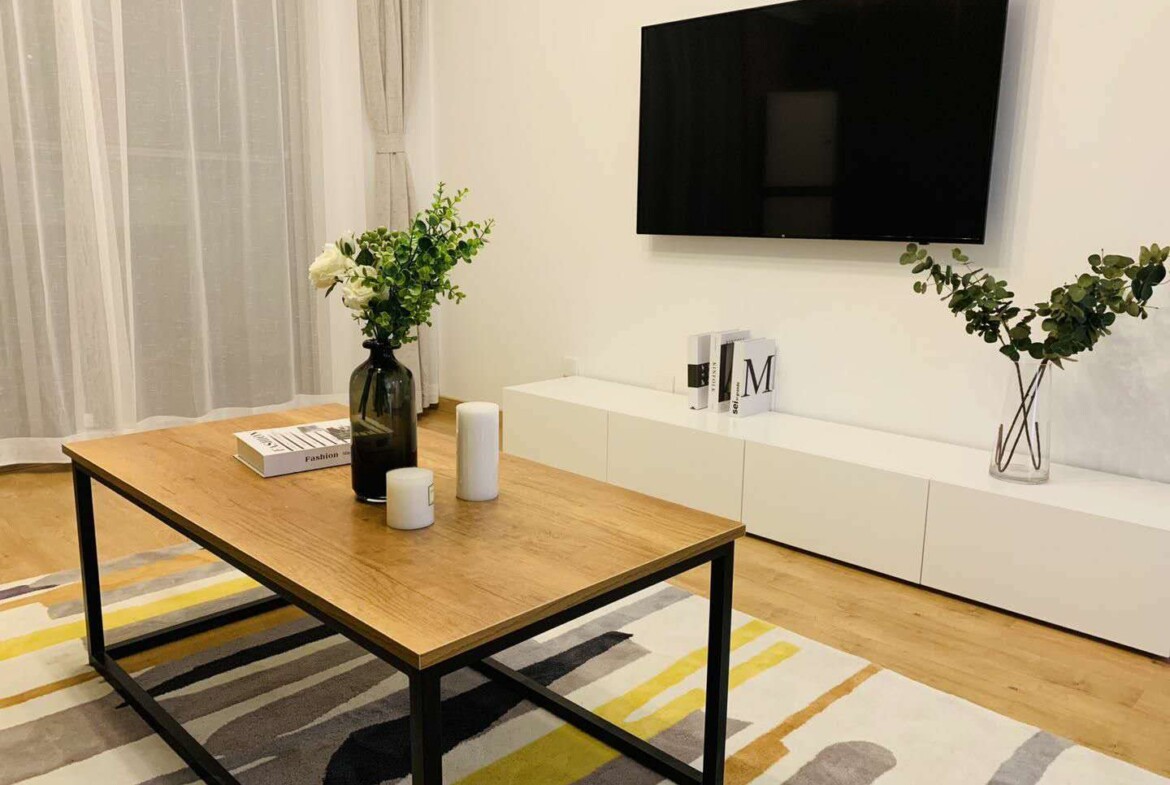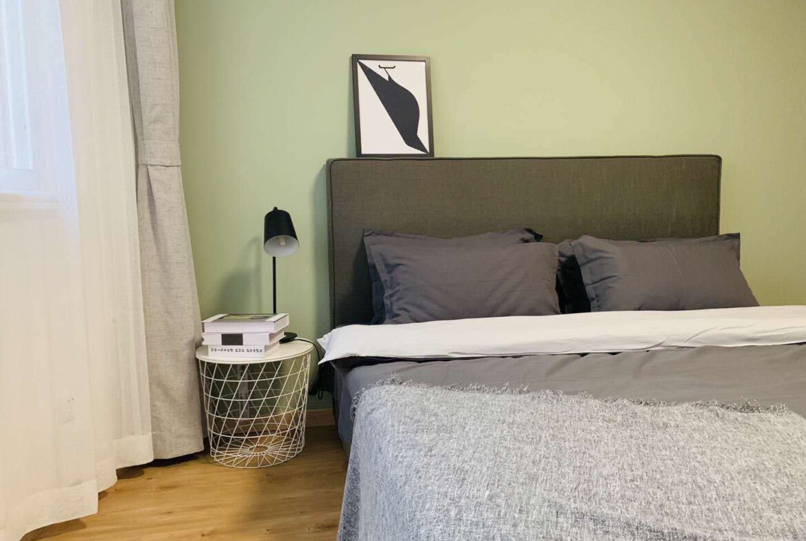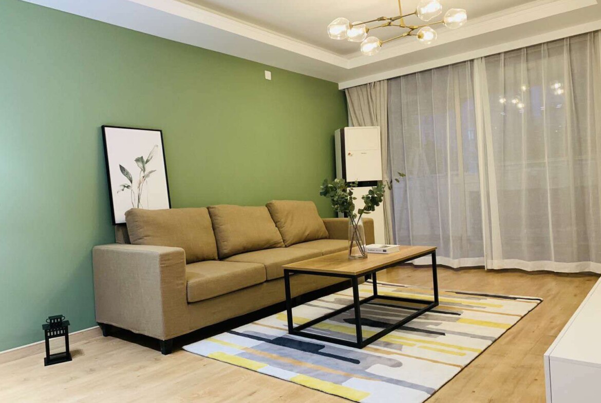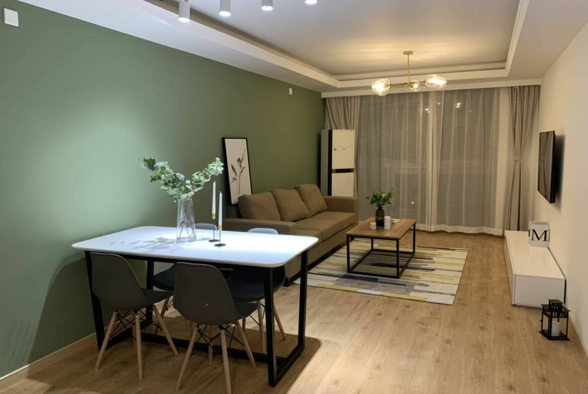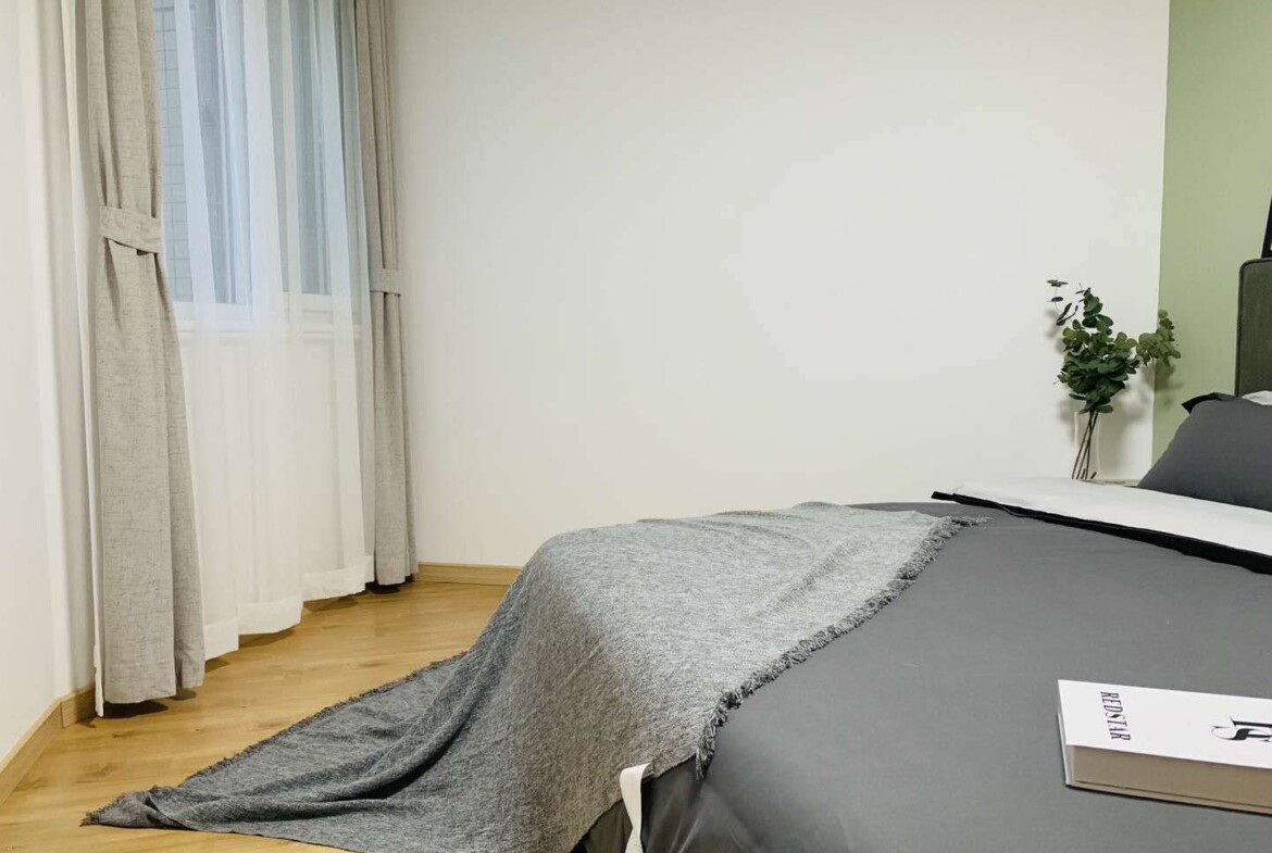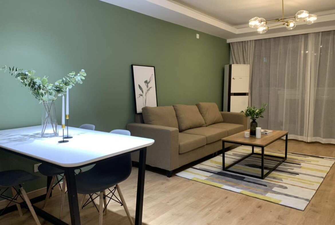 This first-rental, fully renovated two-bedroom, one-bath home in Mandarine City Phase 1 is a refined base in Hongqiao, designed for residents who value light, quiet, and practical functionality. Floor-to-ceiling windows frame leafy internal vistas, filling the open-plan living and dining area with soft, natural light throughout the day. The calm, neutral palette and quality finishes create a soothing backdrop that pairs well with contemporary or classic furnishings.