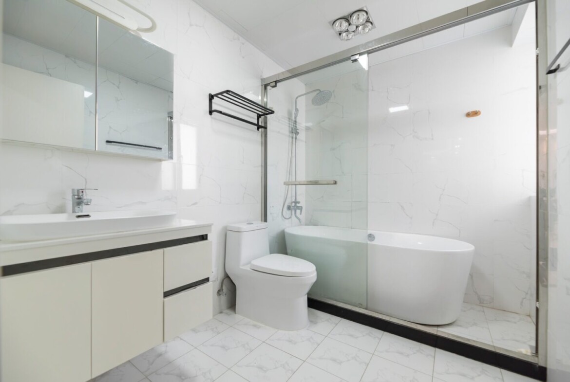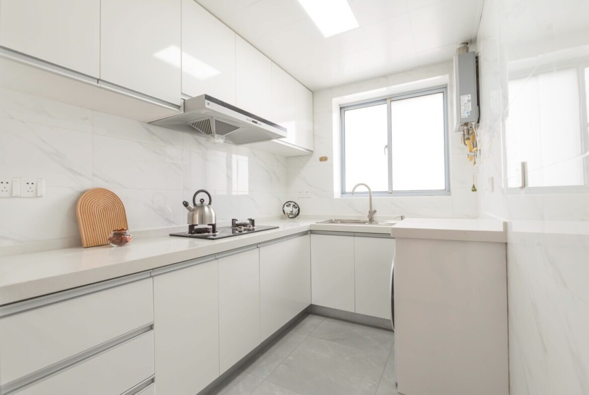 The sleek bathroom features a bathtub, a coveted perk in Shanghai that encourages long evening soaks. A compact, well-organized kitchen pairs contemporary cabinetry with durable worktops to streamline weeknight cooking and weekend brunches. Step onto the private balcony for morning coffee, fresh air, and a leafy glimpse over the compound’s interiors. Materials and finishes were chosen for longevity and easy maintenance, ensuring the home remains as effortless as it is elegant.