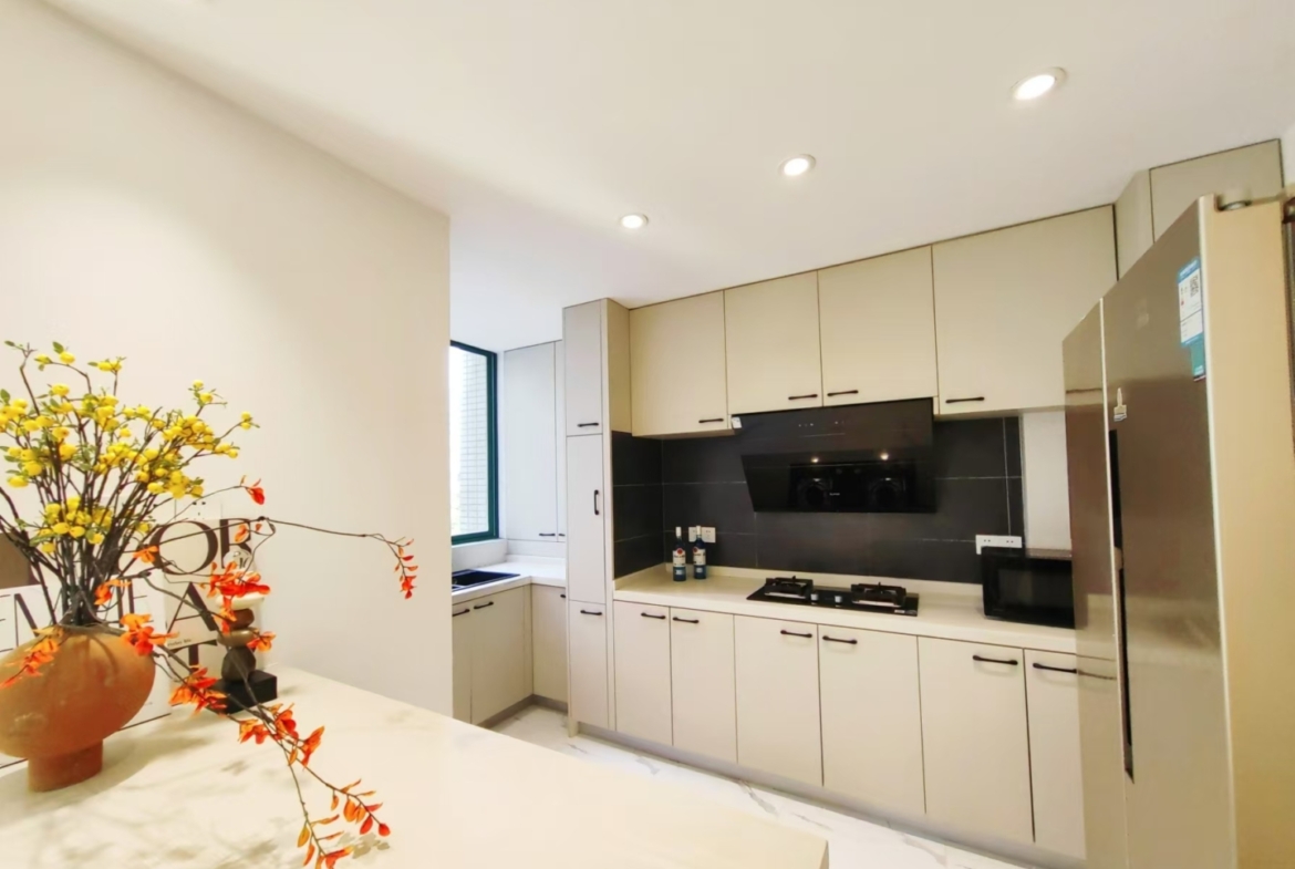 The primary suite is a comfortable retreat, and the second and third bedrooms offer flexibility—configure as guest room, study, or nursery. Two well-appointed bathrooms include a bathtub, a rare and welcome feature for unwinding after work or warming up on cooler days. Installed heating keeps winters comfortable, complementing efficient cooling for Shanghai’s summers. The modern kitchen is designed for everyday cooking as well as weekend entertaining, with ample counter space, sensible cabinetry, and proper ventilation.