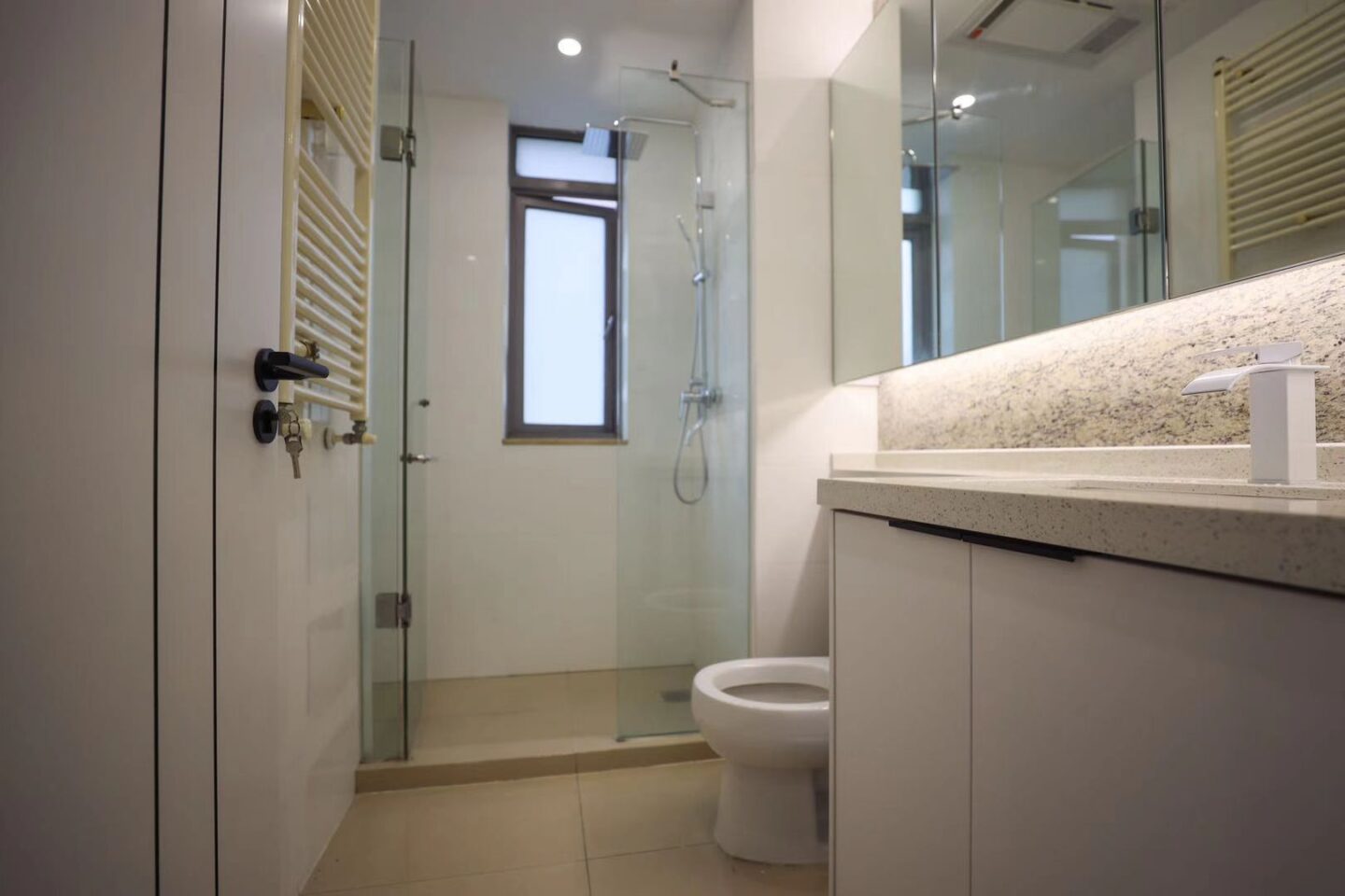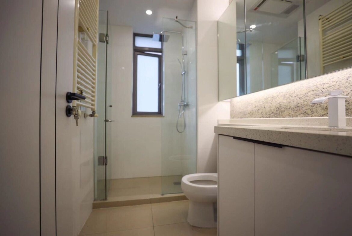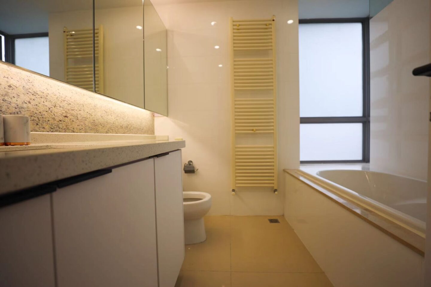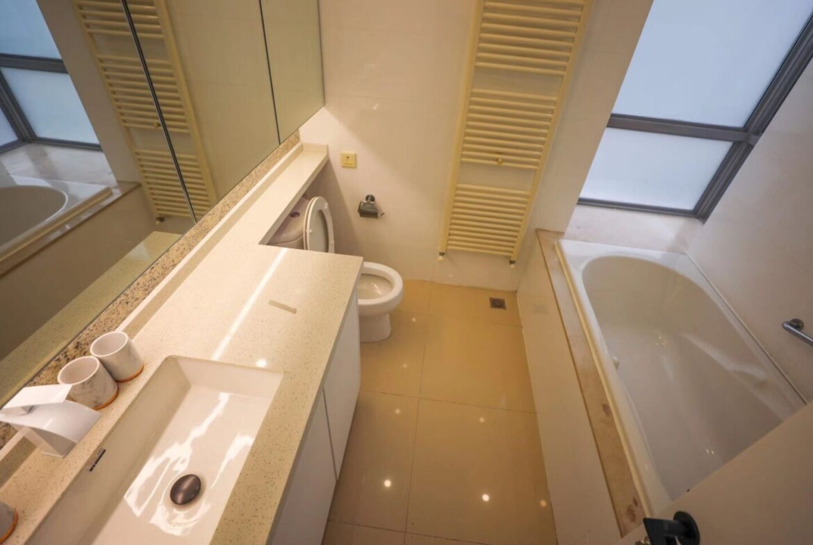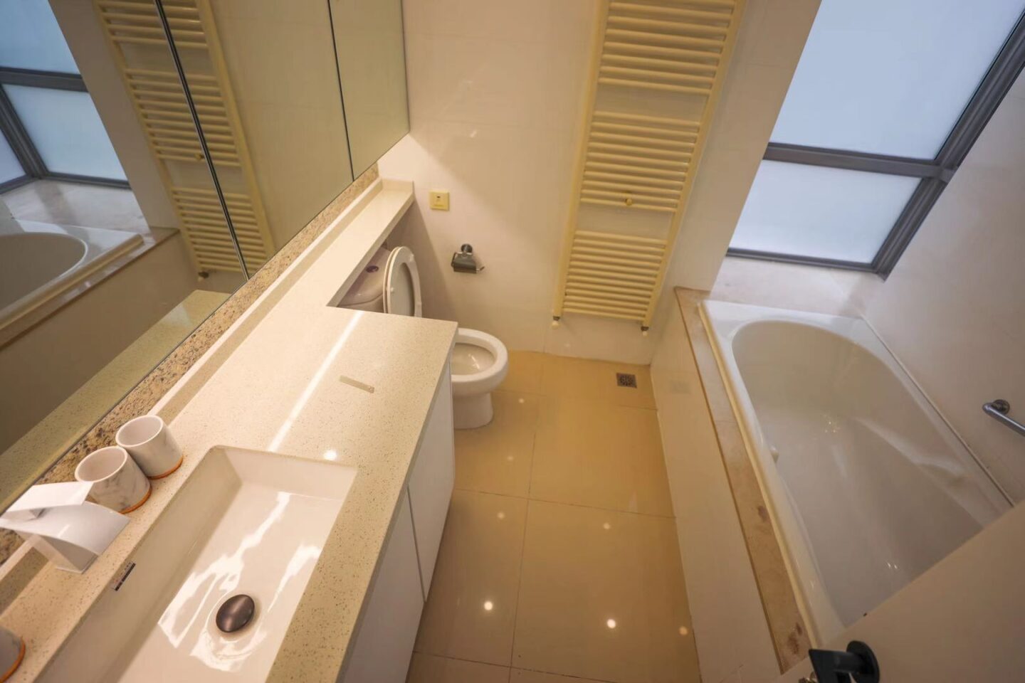Light, space, and livability: Floor-to-ceiling windows and an outdoor space make day-to-day life feel airy and connected to the city. The bathtub is a practical luxury—rare in Shanghai apartments and a treat after long days.