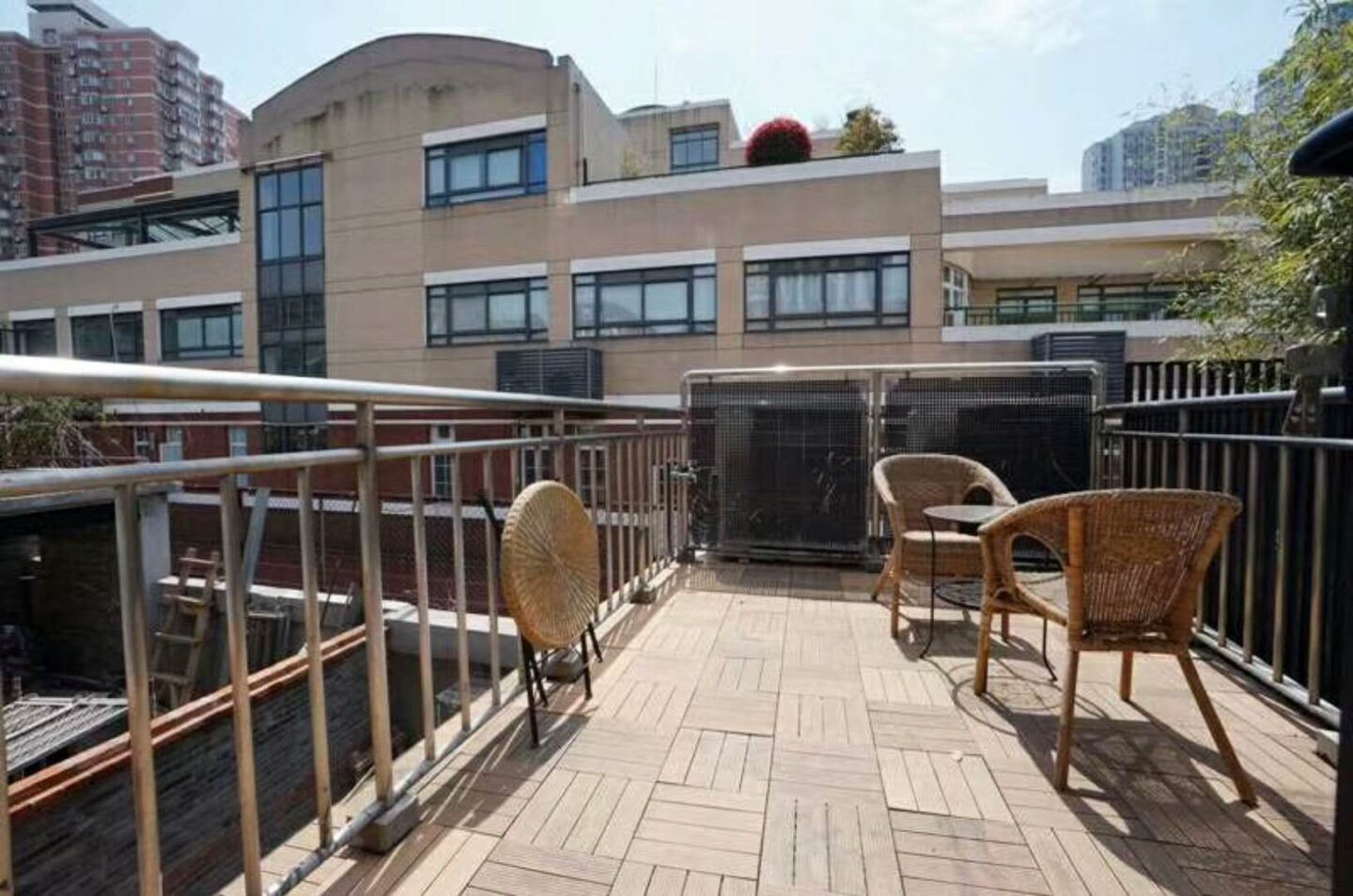Climate control is comprehensive with central air conditioning and reliable heating, ensuring comfort through all Shanghai seasons. A contemporary kitchen offers generous storage and work surfaces for easy weeknight cooking and weekend entertaining. Large windows invite natural light and frame leafy lane views, creating an uplifting ambiance throughout. The ground-level yard is perfect for morning coffee, relaxed play, or a small herb garden, while the roof deck becomes your private venue for twilight dinners under the skyline glow.
