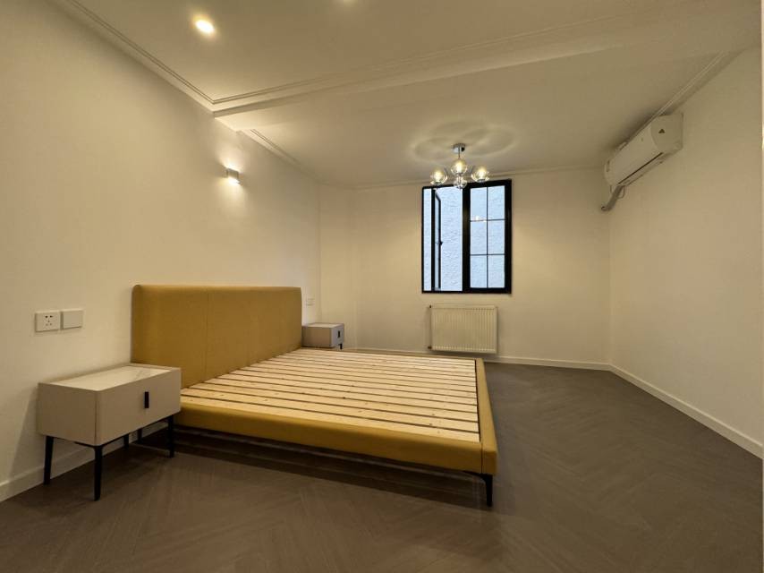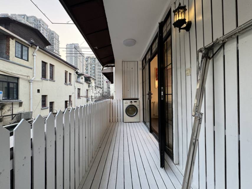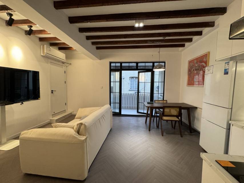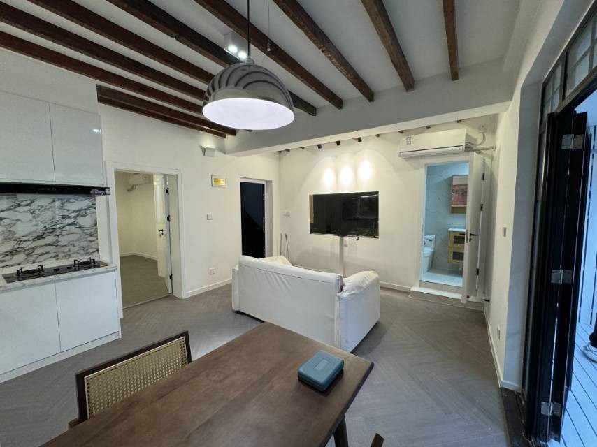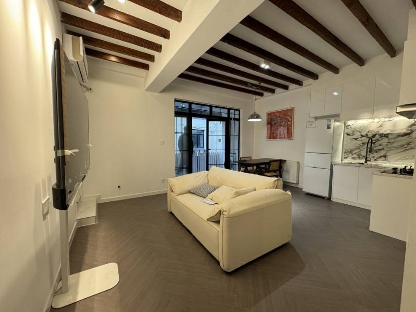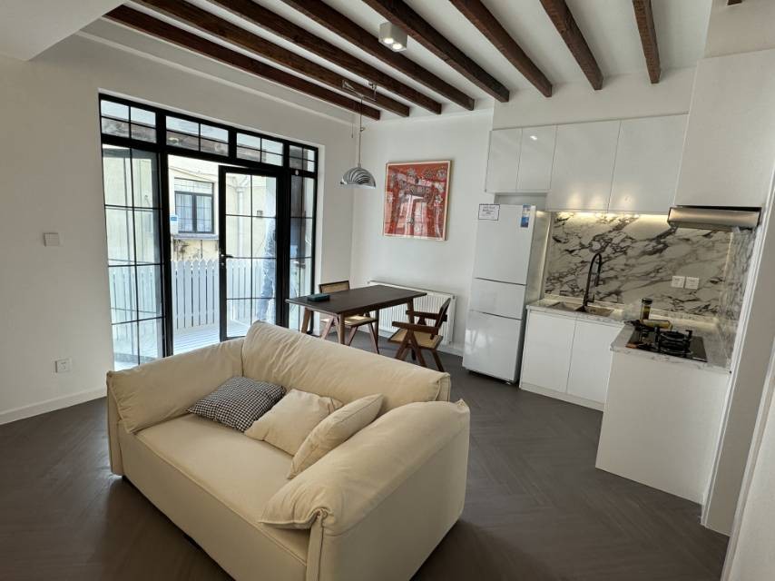 This inviting 1-bedroom, 1-bathroom Shanghai Lane House for rent was fully renovated and is offered as a first rental, which means clean lines, fresh finishes, and never-before-used appliances. Set on an upper floor of a classic lilong building just off Shaanxi South Road, the home blends heritage details with thoughtful modern upgrades. The living area is proportioned for both lounging and dining, with smooth wood floors and restored windows that bring in soft natural light. The petite balcony provides a leafy outlook over the lane, perfect for morning coffee or an evening glass of wine.