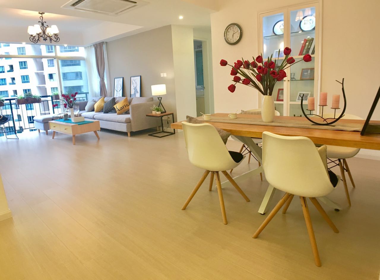 Discover modern living in this 155 sqm Shanghai apartment for rent in the heart of Jing’an. Featuring three well-sized bedrooms and two sleek bathrooms, the unit is fully renovated with a focus on style and comfort. Enjoy expansive floor-to-ceiling windows in the living area, flooding the space with natural light and offering vibrant city views. The open-plan design seamlessly connects the living room and dining area, accentuated by elegant finishes. Relax on the balcony with its picturesque views, perfect for unwinding after a day in the bustling city.