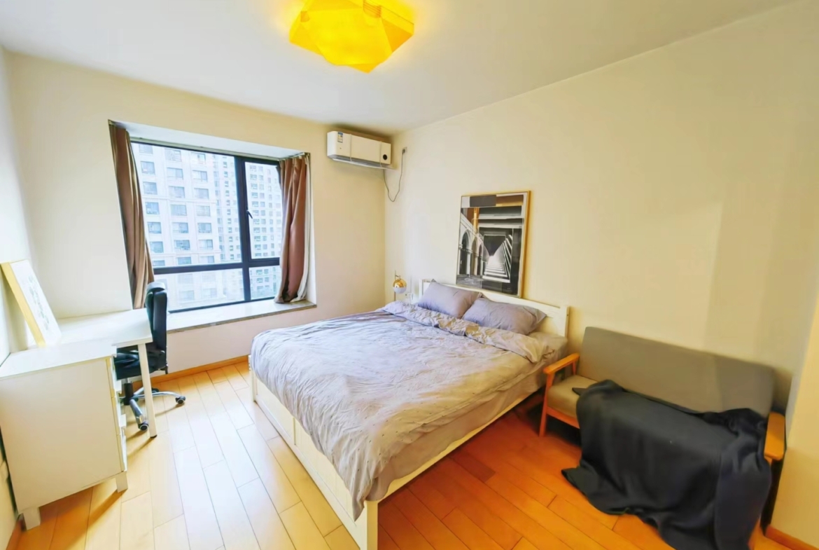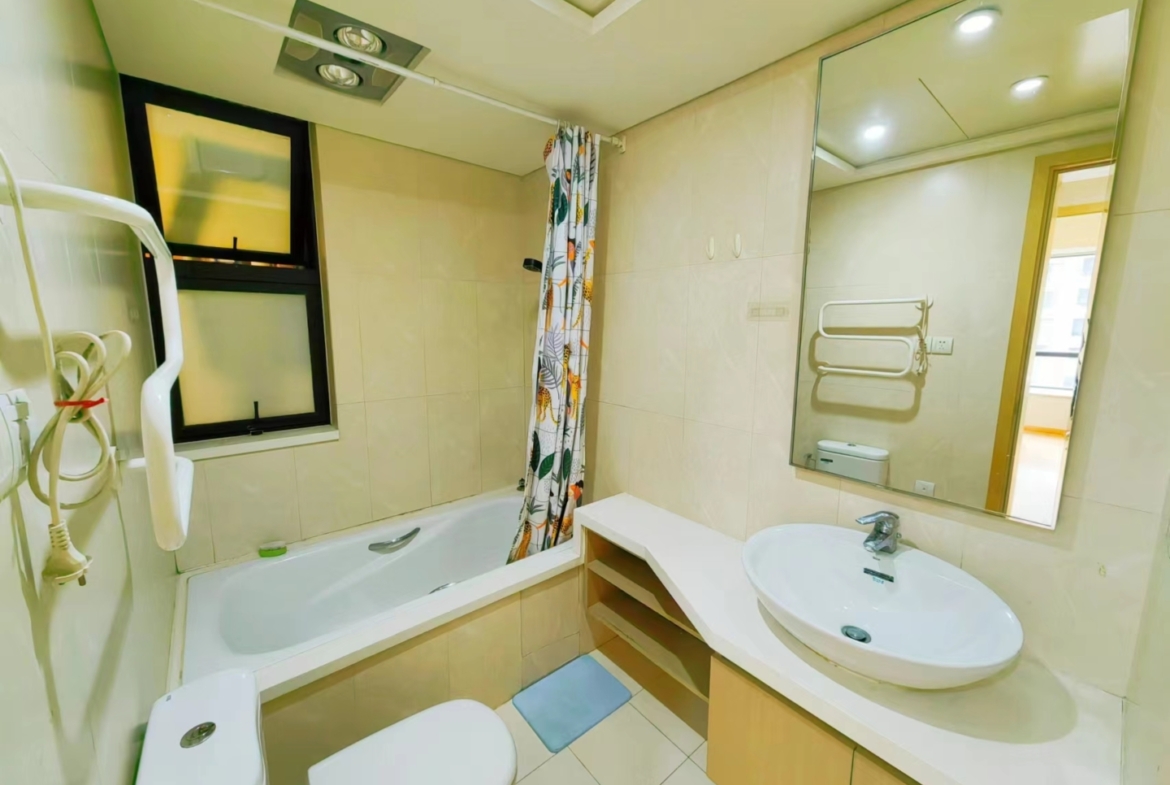 Comfort is a priority: heating provides reliable warmth in winter, and air conditioning keeps summers pleasant. The kitchen is streamlined for efficiency, with smart storage and quality fixtures that make home cooking straightforward. In the bathroom, a proper bathtub offers a rare treat in Shanghai apartments, perfect for a relaxing soak after a long day.