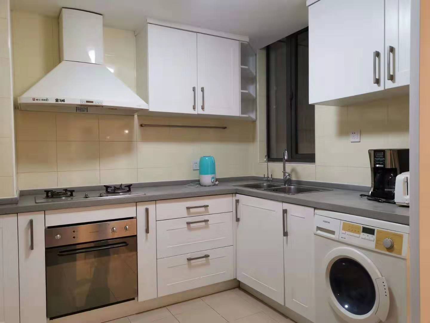Both bedrooms are well-proportioned, offering flexibility for a principal suite and a dedicated home office or guest room. The bathroom features a bathtub for restorative soaks, a rarity and a genuine luxury in central Shanghai. Comfort is assured year-round with air conditioning and heating, while ready-to-go WiFi makes remote work seamless. The kitchen presents sleek cabinetry and efficient work surfaces that support everyday cooking without crowding the living area.