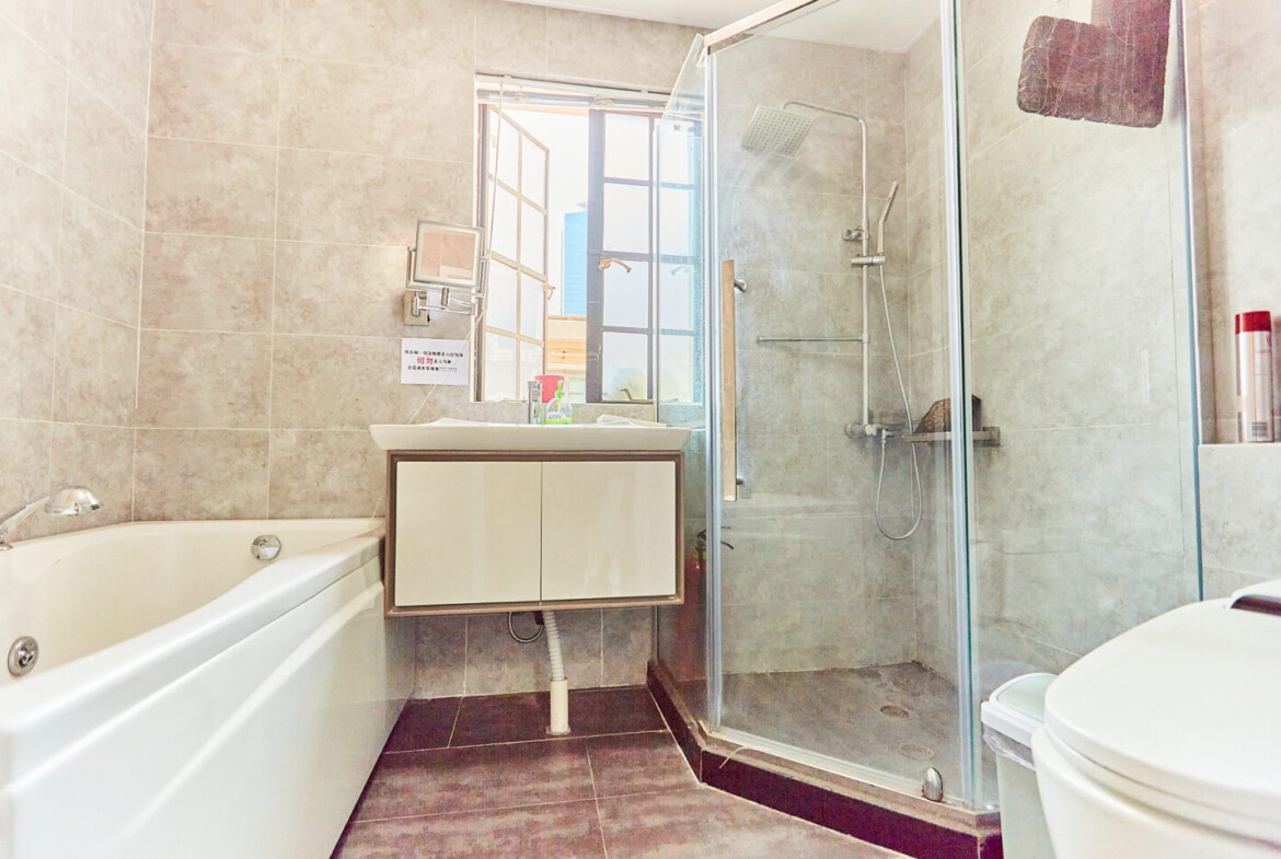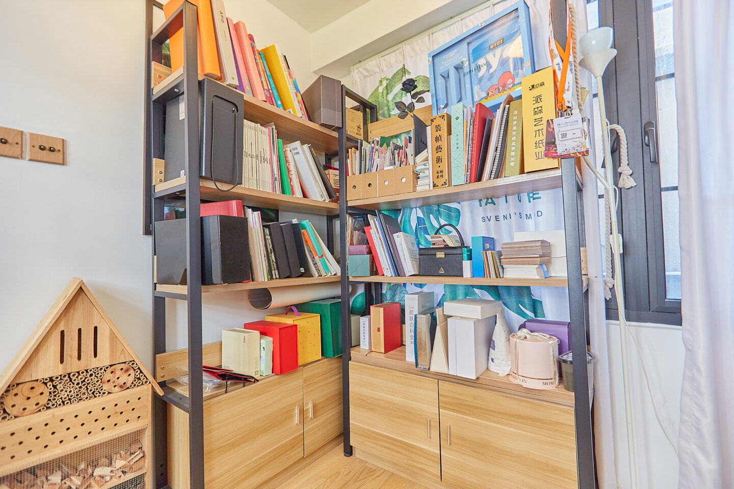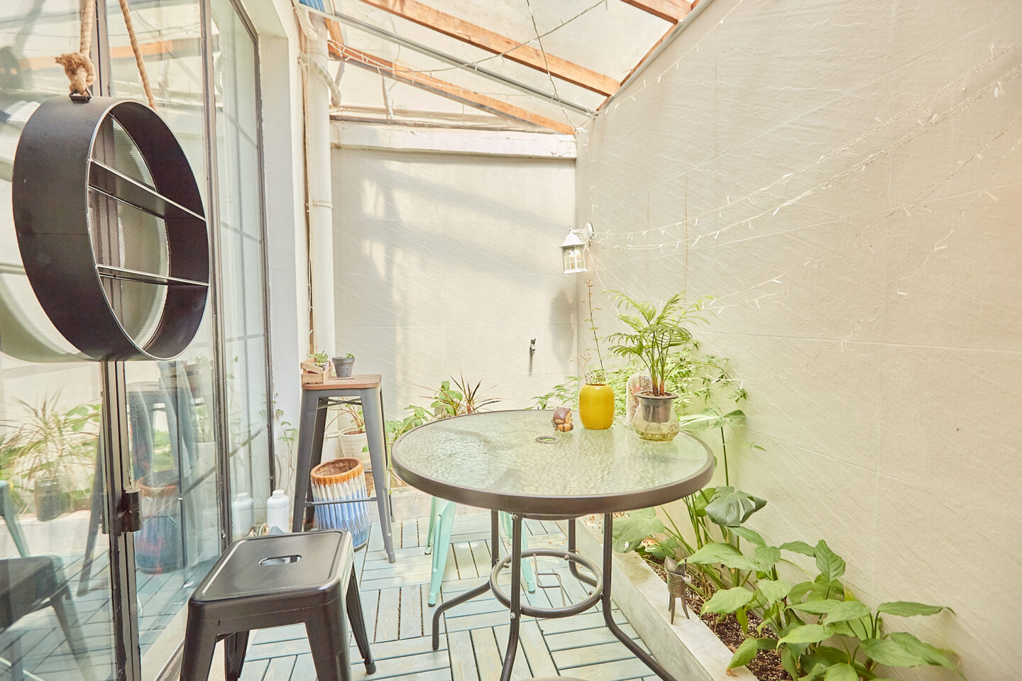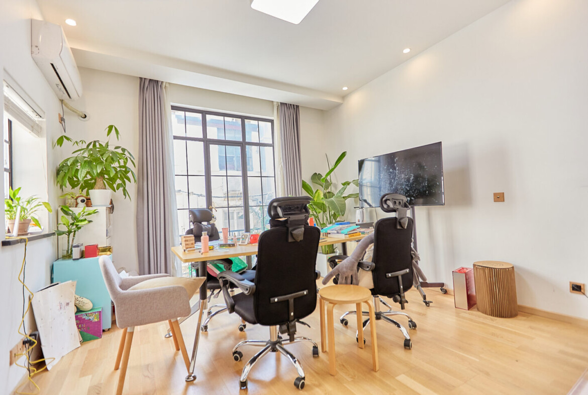 One level above, the quiet sleeping floor offers two well-proportioned rooms and two bathrooms, including a relaxing soaking bathtub that is a prized find in Shanghai’s historic housing. The top floor crowns the home with a bright studio-like landing leading to a balcony currently arranged as a workspace, equally suited to a home office, yoga nook or reading terrace. Cross-breezes and floor-to-ceiling windows keep the interiors fresh, while independent heating and air conditioning plus high-speed WiFi support comfortable year-round living and seamless remote work.