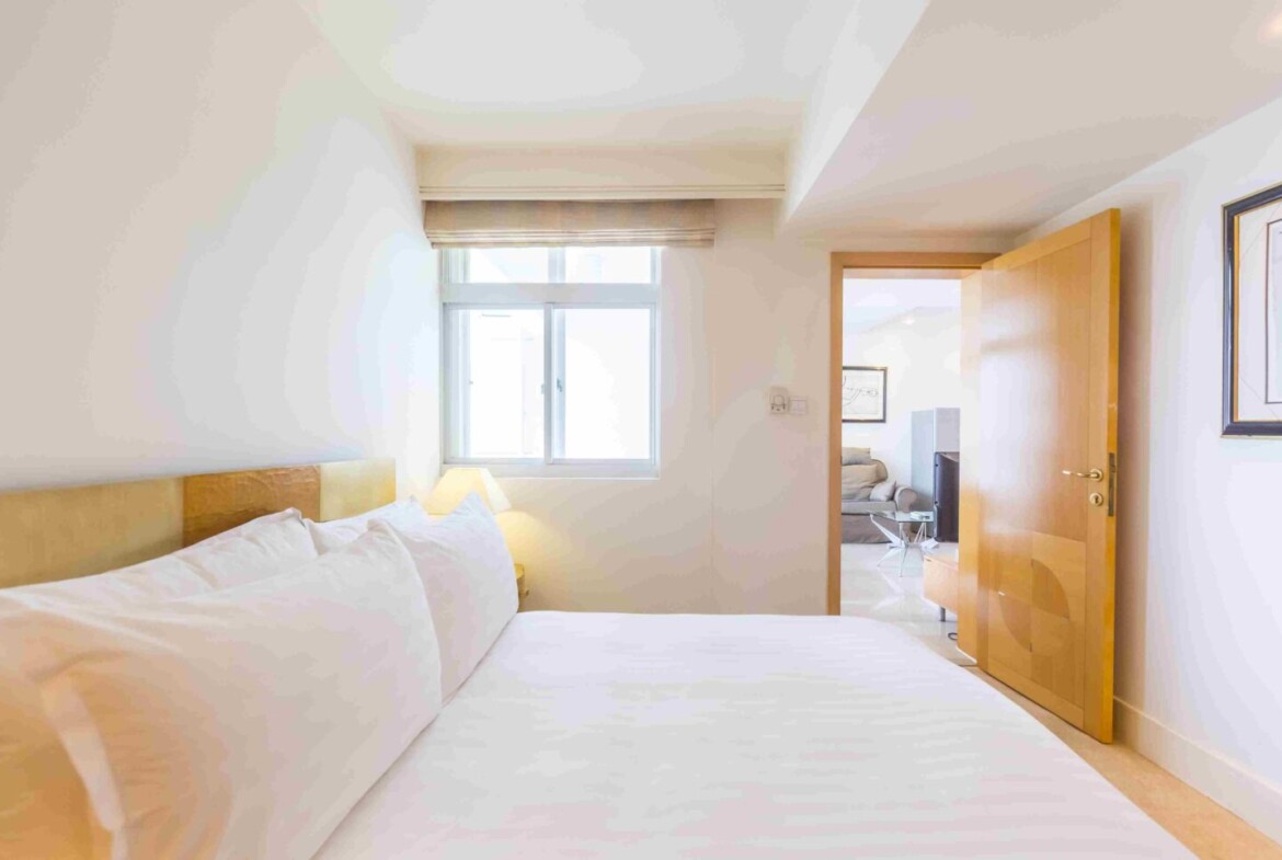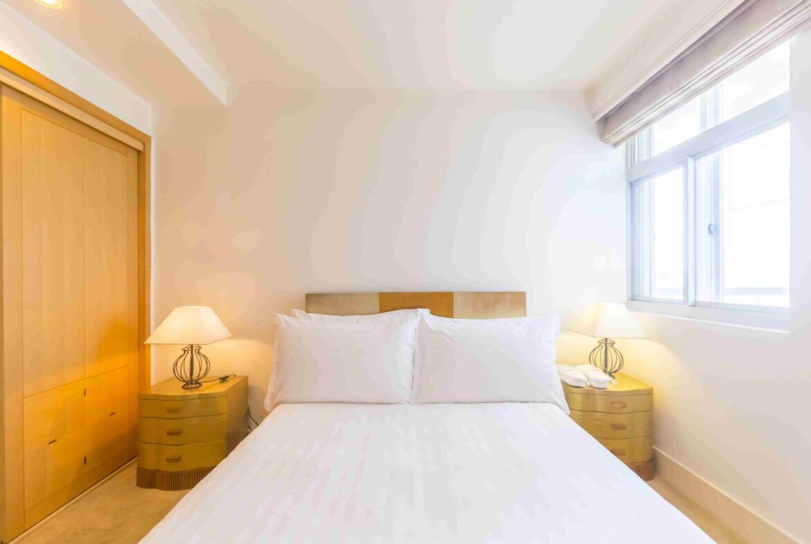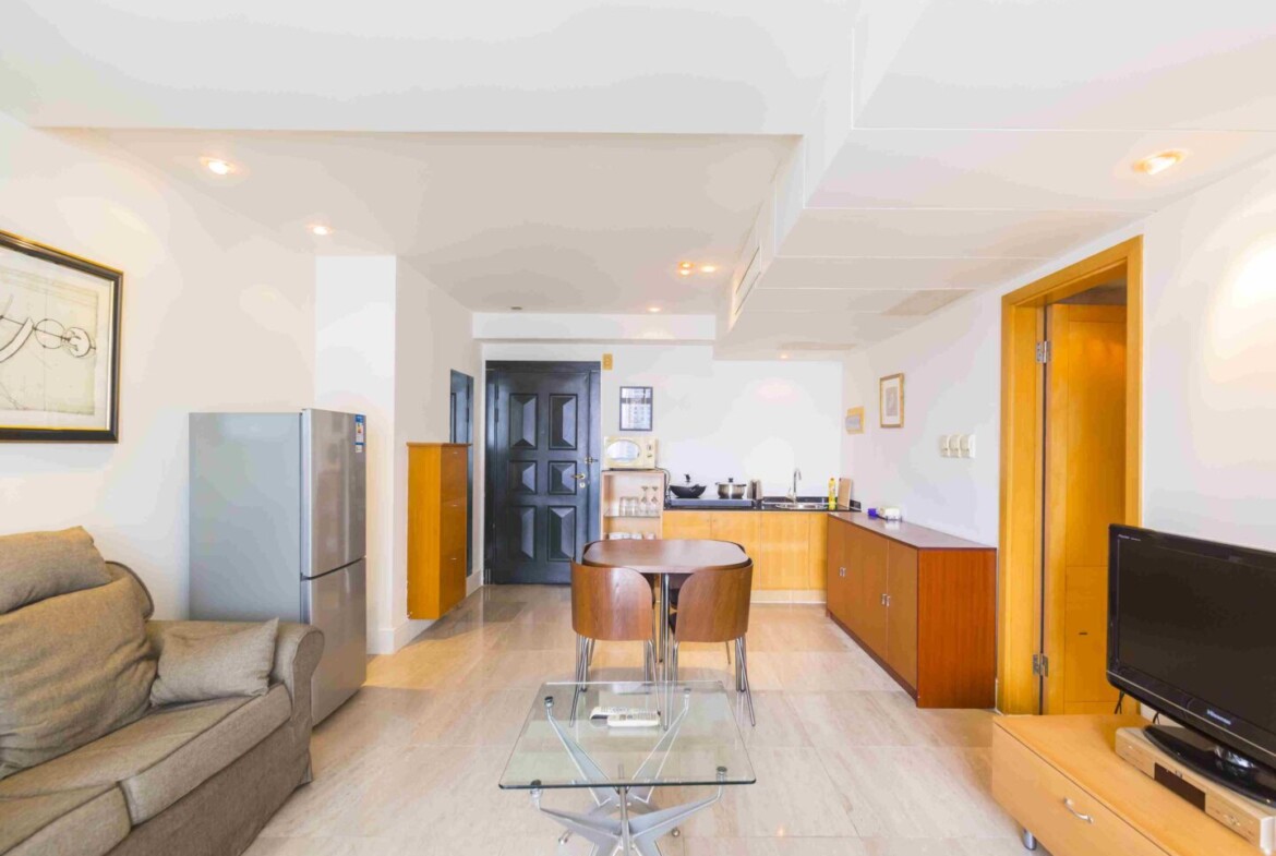 The bathroom features a full-size bathtub, a welcome luxury in compact city apartments and perfect for unwinding after a busy day. Climate control is handled by split units for both cooling and heating, making year-round comfort straightforward. Large windows invite natural light while quality curtains ensure restful sleep and controlled privacy. Finishes are contemporary without being fussy, easy to maintain, and designed for the rhythms of daily life.