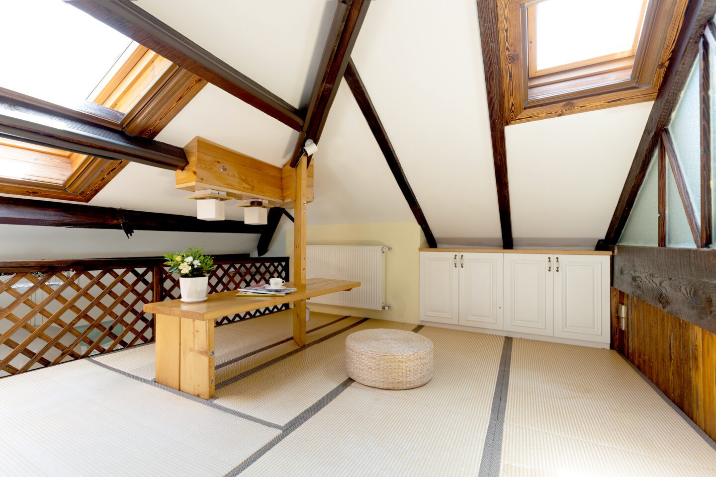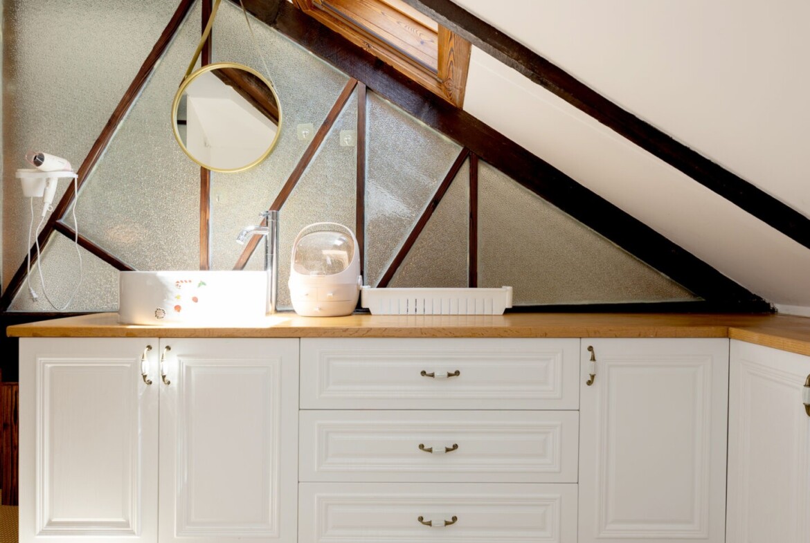 A well-planned stair rises to an open loft sleeping space, creating a calm retreat distinct from the social zone below. The bathroom features a bathtub, a sought-after luxury in the city that encourages lingering, spa-like evenings. Year-round comfort is ensured by heating and air conditioning, while the top-floor position provides privacy and a serene outlook over the historic rooftops. The duplex layout gently separates living, resting, and working needs, making it a smart choice for a single professional or a couple who value both style and function.